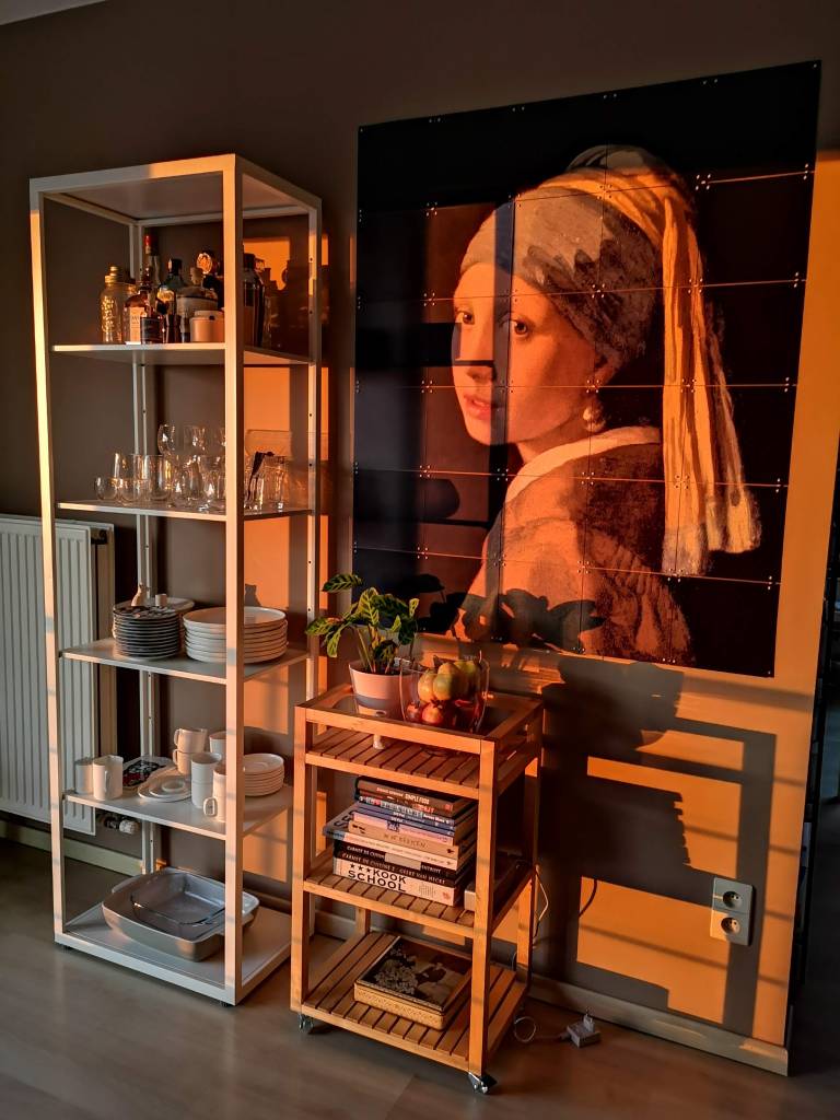 De kers op de taart bij een opgeruimde keuken is kunst. Waarschijnlijk gebruik je niet alle kopjes, schalen of borden dus die kan je perfect verzamelen in een goede kast. Mijn kolomkast is van Ikea. Als je kast of keukeneiland niet je hele wand inneemt, laat kunst de ruimte dan opvullen. Met eten en drinken altijd aanwezig kan je veel thema’s gebruiken. Het meisje met de parel a.k.a. het melkmeisje van Johannes Vermeer kijkt hier mee over mijn schouder tijdens het koken. Deze poster is eentje van IXXI, super handig om aan je muur te hangen zonder gaten. Ik ben zelf ook fan van zwart wit posters met quotes. Het voordeel is dat je met posters gemakkelijk kan afwisselen. Ga ervoor!